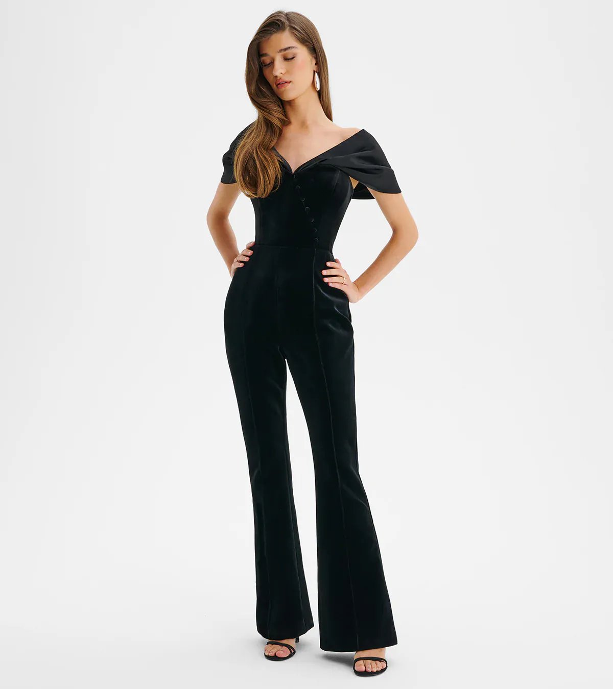 YASMIN Off Shoulder Embellished Tulip Dress with Sheer Detail in Black