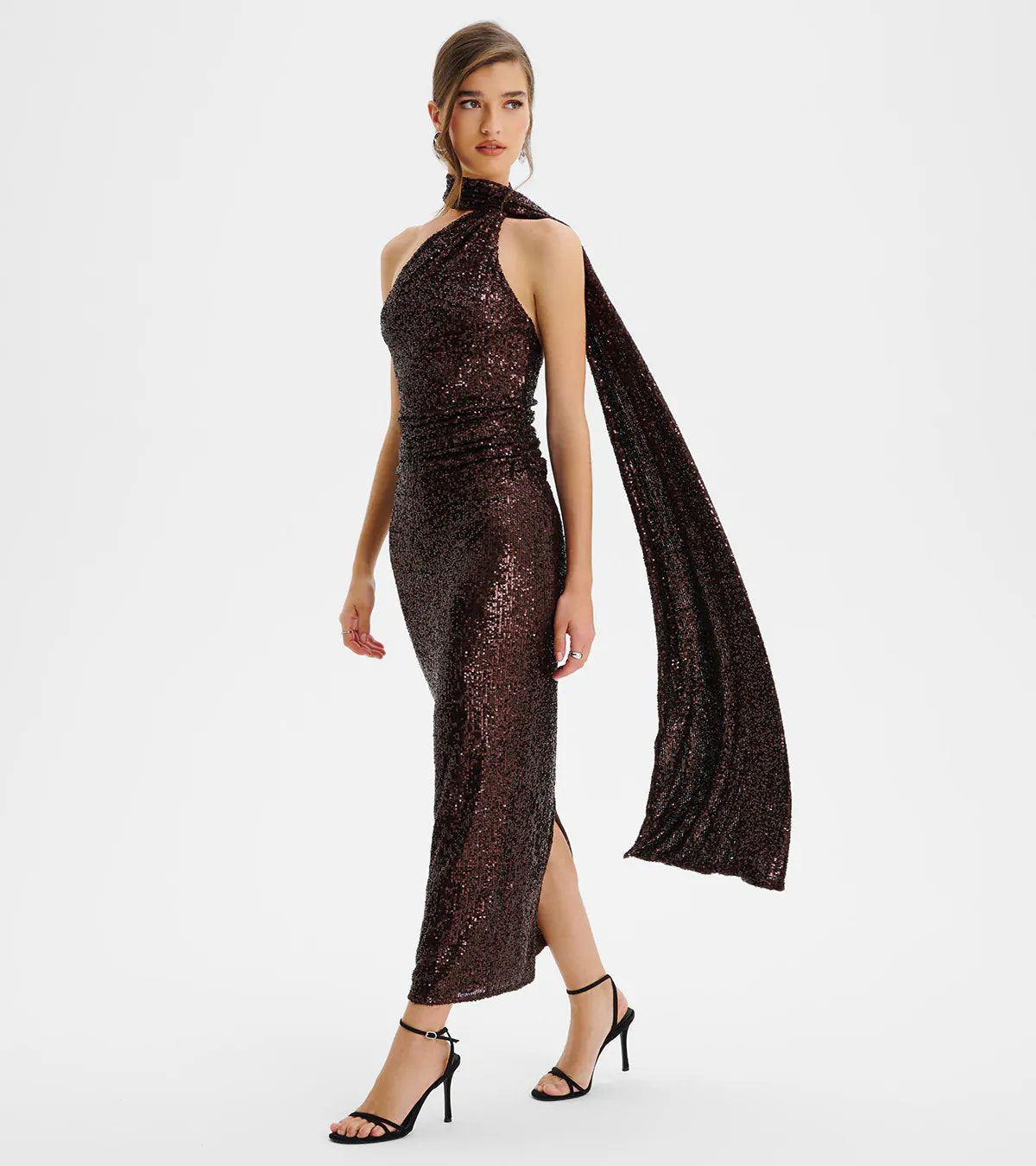 SERENITY Curve Stretch Sequin Bandeau Wrap Dress in Silver