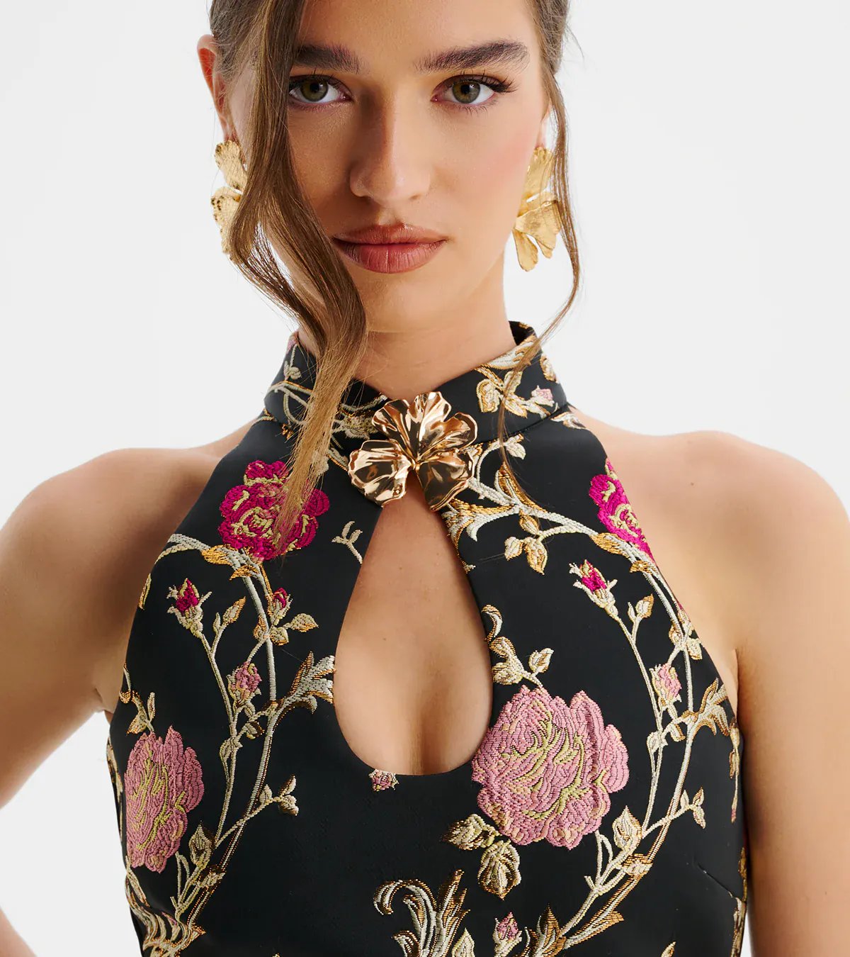 VIOLETTA Metallic Floral Brocade High Neck Mini Dress In Black