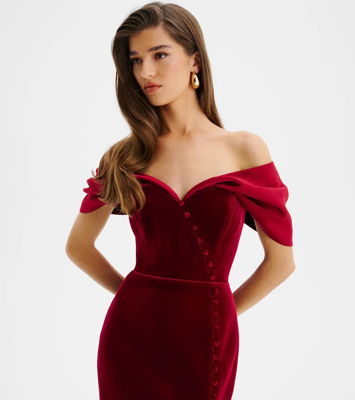SOFIE Off Shoulder Pleated Obi Belted Jumpsuit in Red
