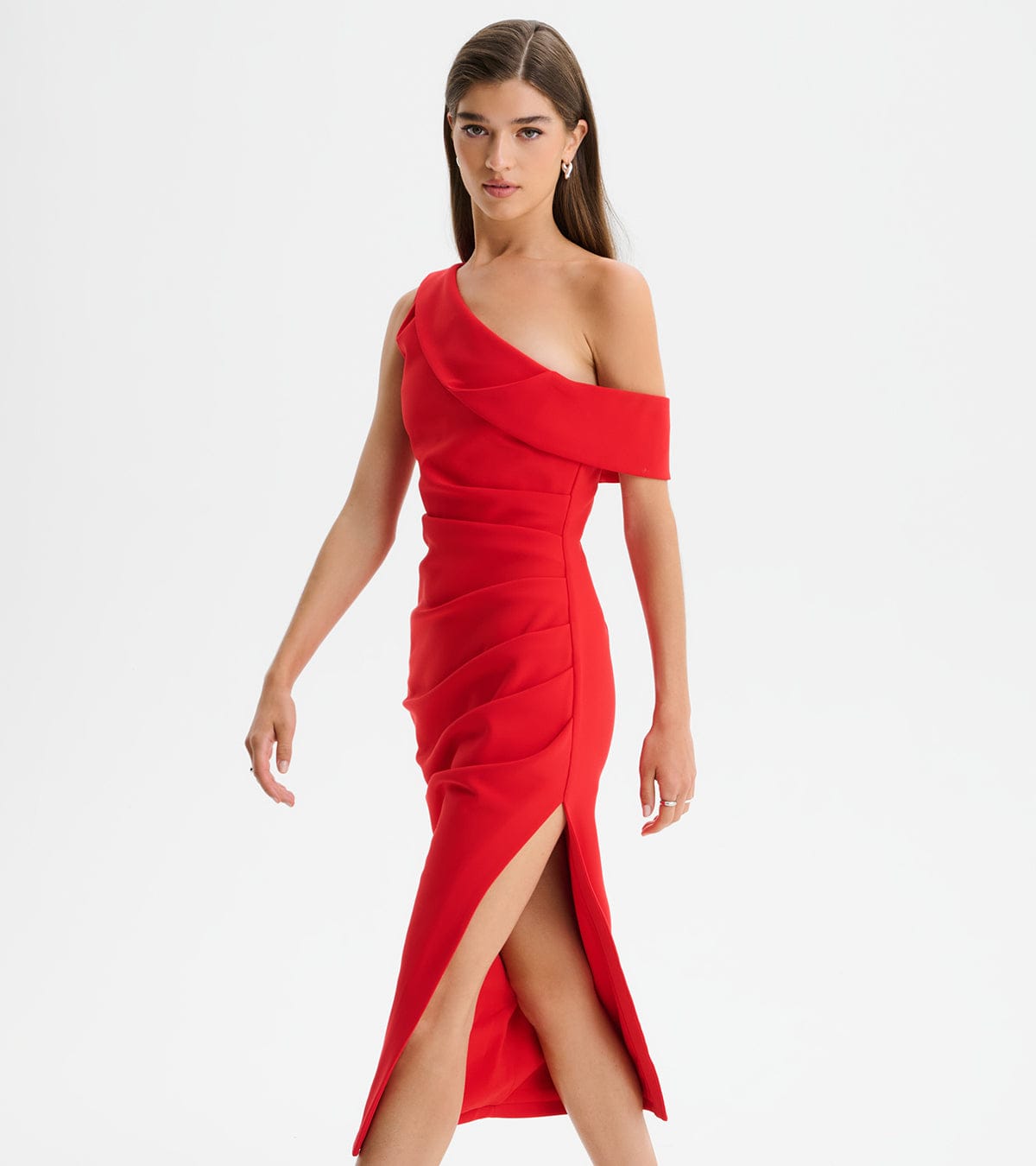 JOSIE Fluted Sleeve Fishtail Maxi Dress in Red