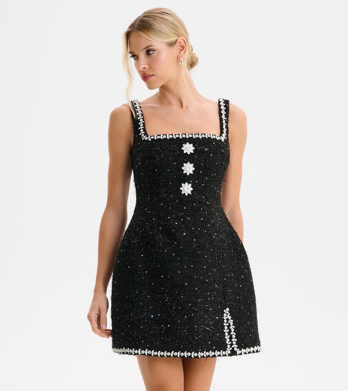 LYLA Sequin Boucle Tulip Mini Dress with Embellishment in Black